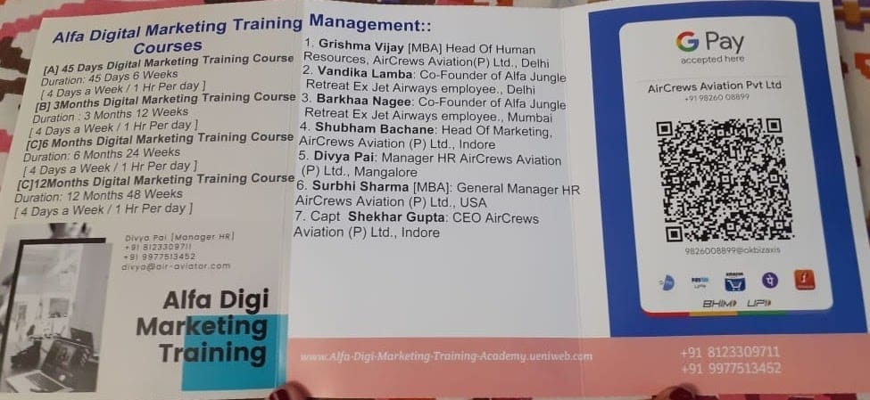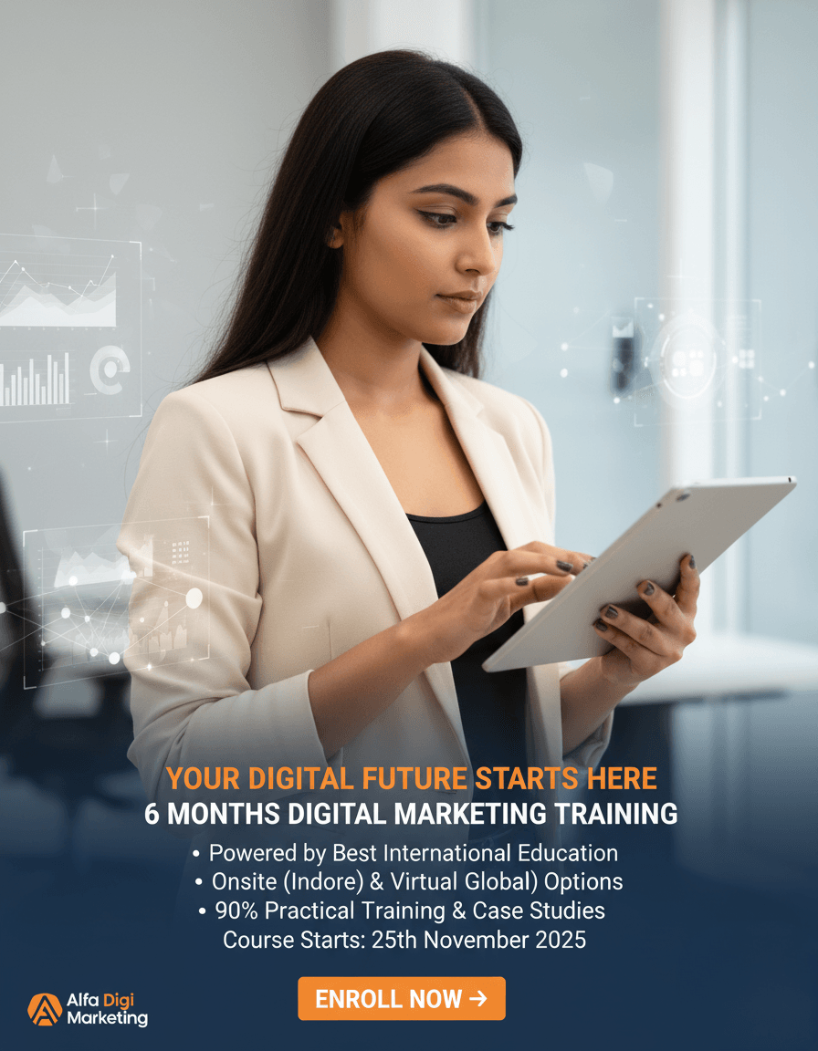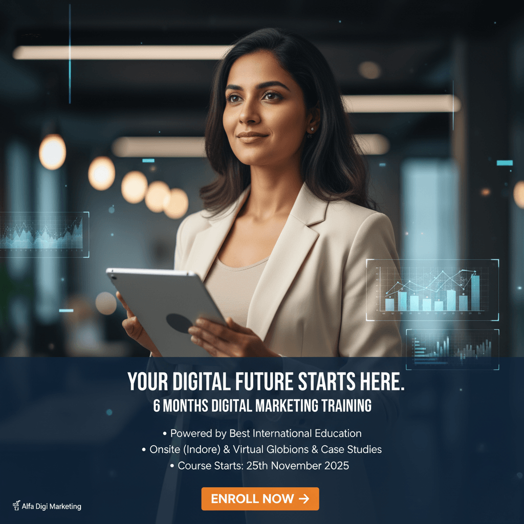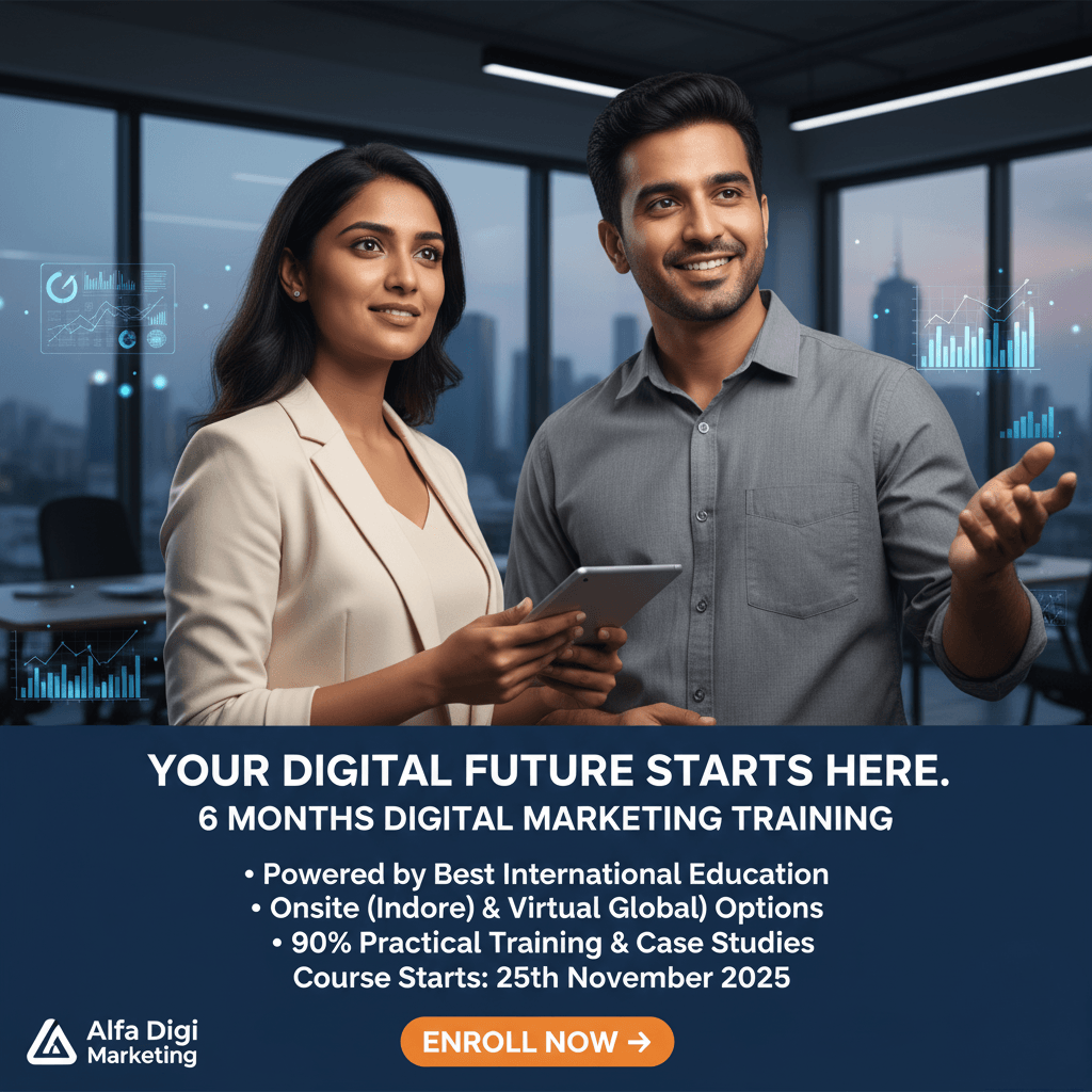 Alfa Digi Marketing Training offers a 6 Months Digital Marketing Course, powered by Best International Education. The program features 90% practical training and is available both Onsite in Indore and Virtually Across the Globe. The next session starts on 25th November 2025, with short, focused classes held at 1500 Hrs to 1545 Hrs.